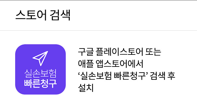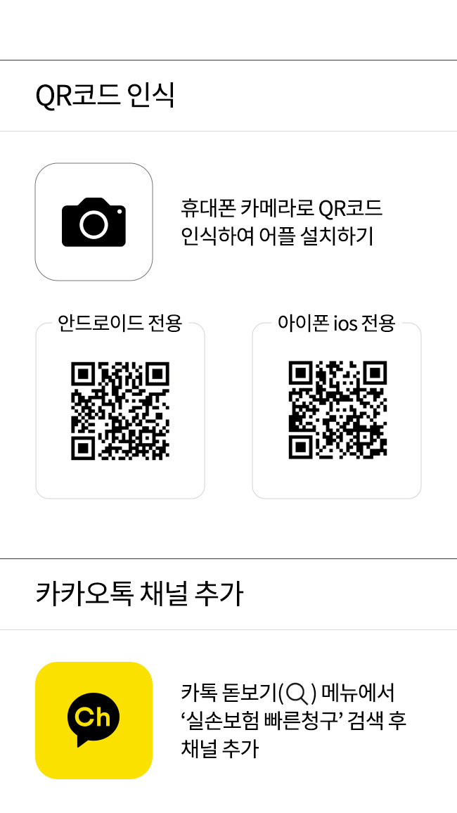 스토어 검색 - 구글 플레이스토어 또는 애플 앱스토어에서 '실손보험 빠른청구'검색 후 설치 / QR코드 인식 - 휴대폰 카메라로 QR코드 인식하여 어플 설치하기 / 카카오톡 채널 추가 - 카톡 돋보기 메뉴에서 '실손보험 빠른청구'검색 후 채널추가