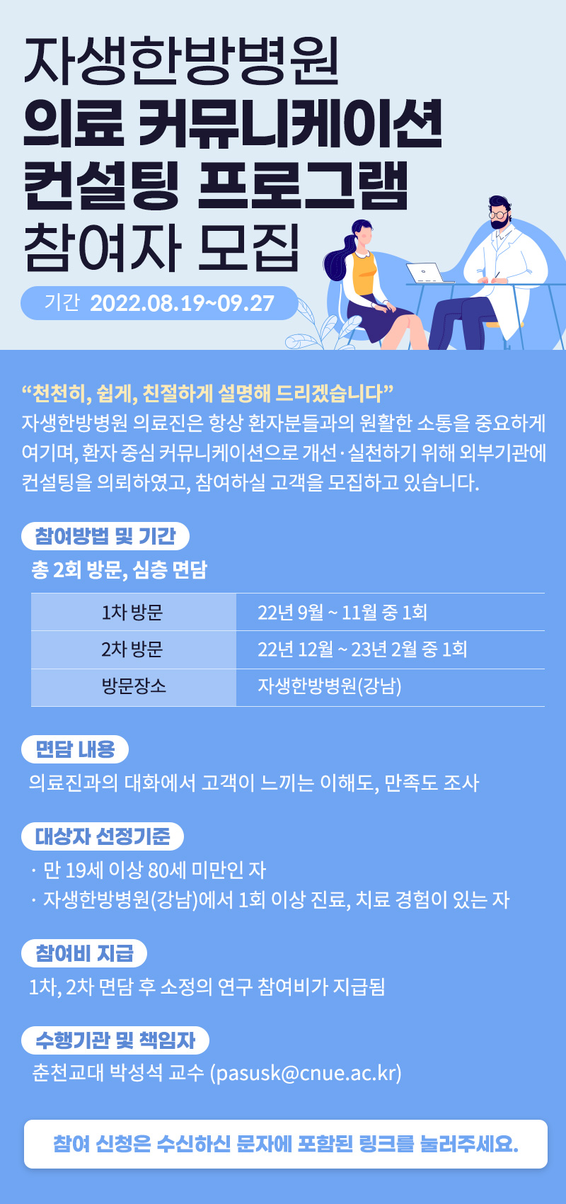 참여 신청을 하시면 담당자가 고객님께 직접 전화드리고, 상담 후 모집대상에 해당 되는지 여부를 연락 드립니다. 접수 후 일주일 전후 연락드릴 예정이나, 접수자가 많을 경우 연락이 더 지연될 수 있는 점 양해 부탁드립니다.